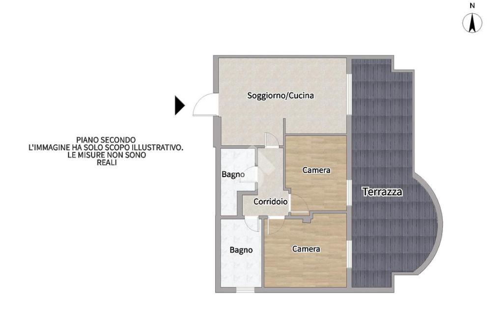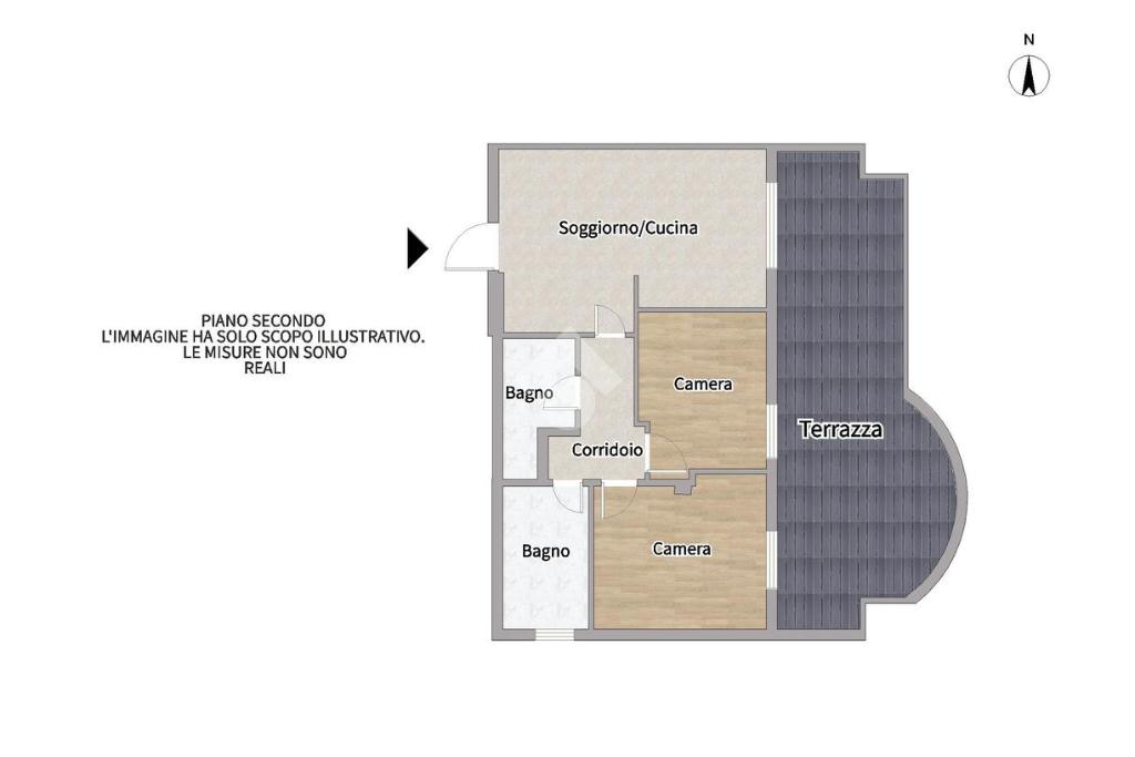 L’immobile si compone di un ingresso su soggiorno con angolo cottura, un disimpegno che porta alla zona notte con due camere e due bagni.